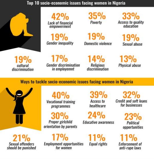 A closer analysis on economic issues alone showed that lack of empowerment (42 percent), poverty (35 percent) and gender discrimination in employment (17 percent) were the top three economic challenges faced by women in Nigerian.
